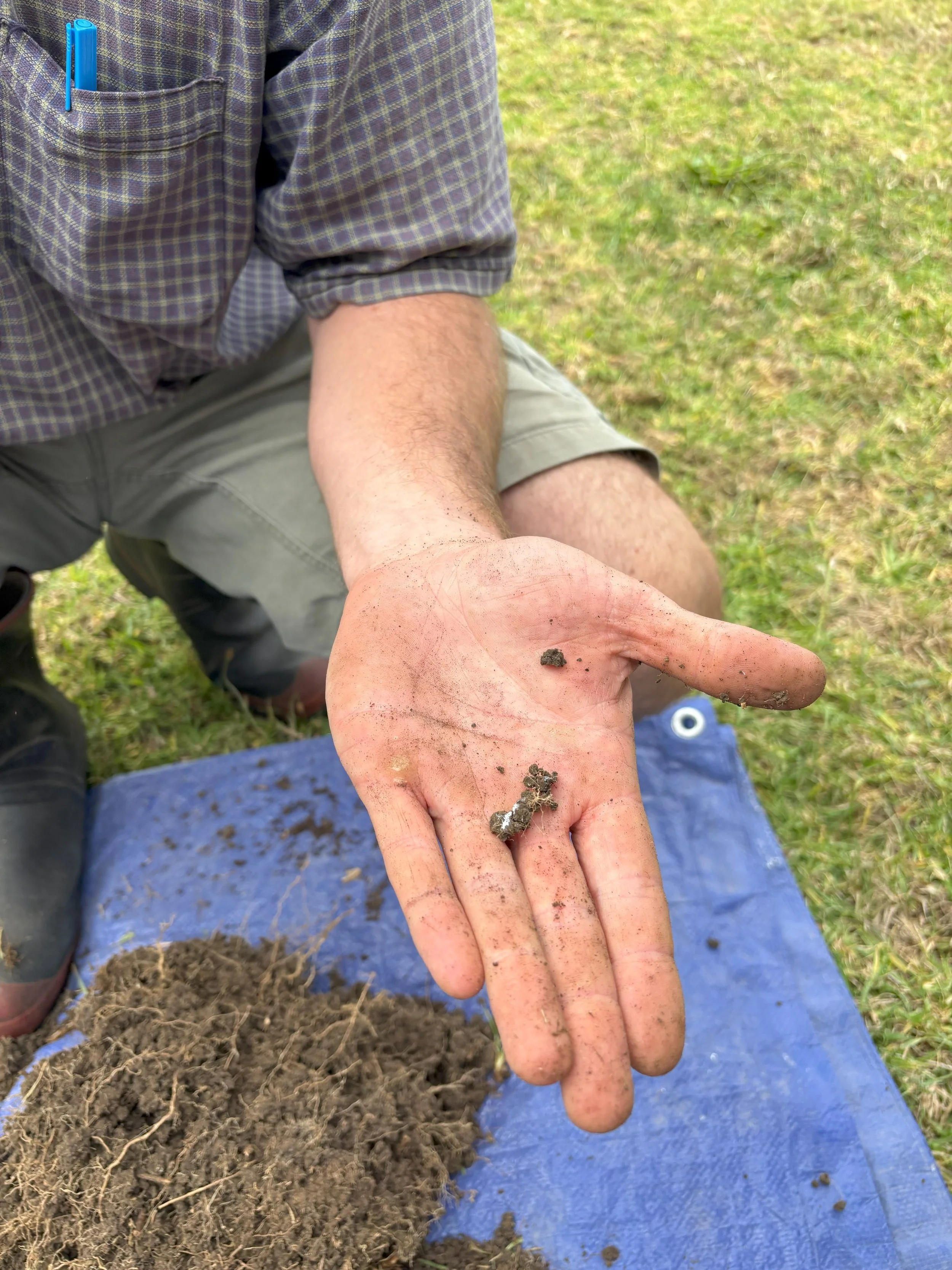 Dan Kelly dug out a small cube of soil to see its make up. Upon inspection the soil was a good consistency to touch and had earthworms and mycorrhizal fungi present.