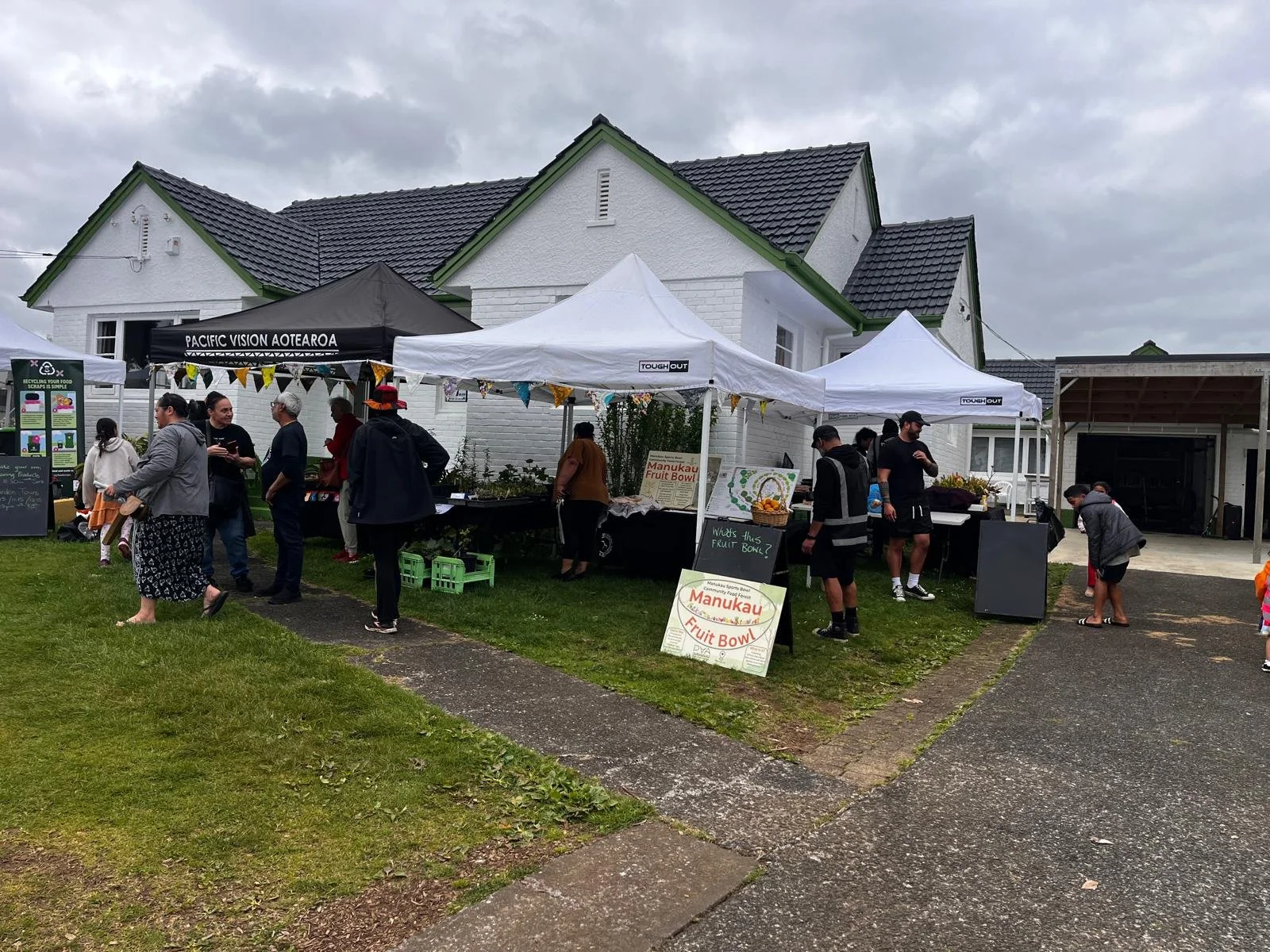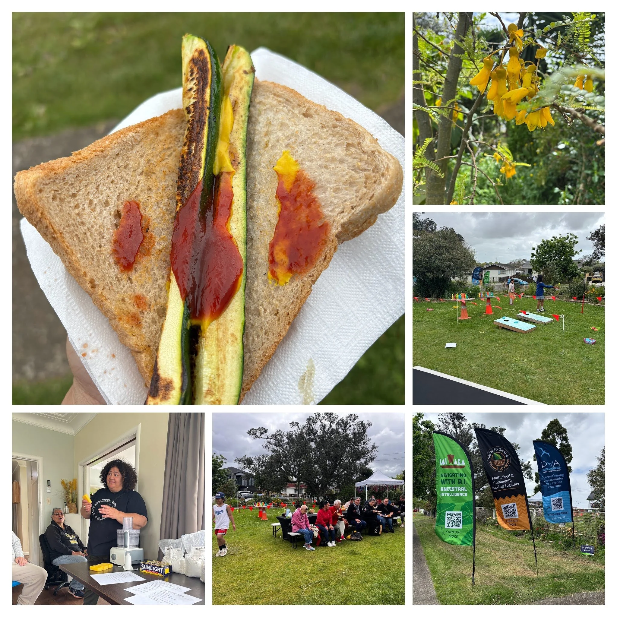 Meanwhile, the sausage sizzle — tended by the Roots Creative crew with fresh salads from Raju kept everyone well fed. Vegetarians weren’t forgotten, with grilled courgette slices proving a hit! Families and neighbours gathered around a long outdoor table, sharing kai, kōrero, laughter, and connection.